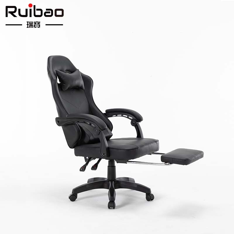 Wholesale synthetic leather all black ergonomic gaming chair with adjustable rotating footrest metal base, suitable for home offices