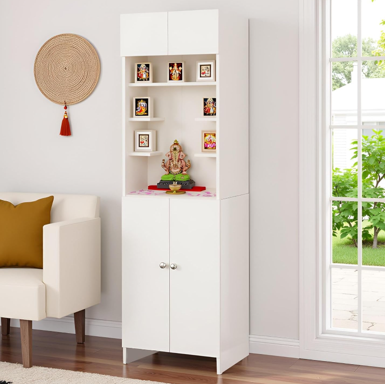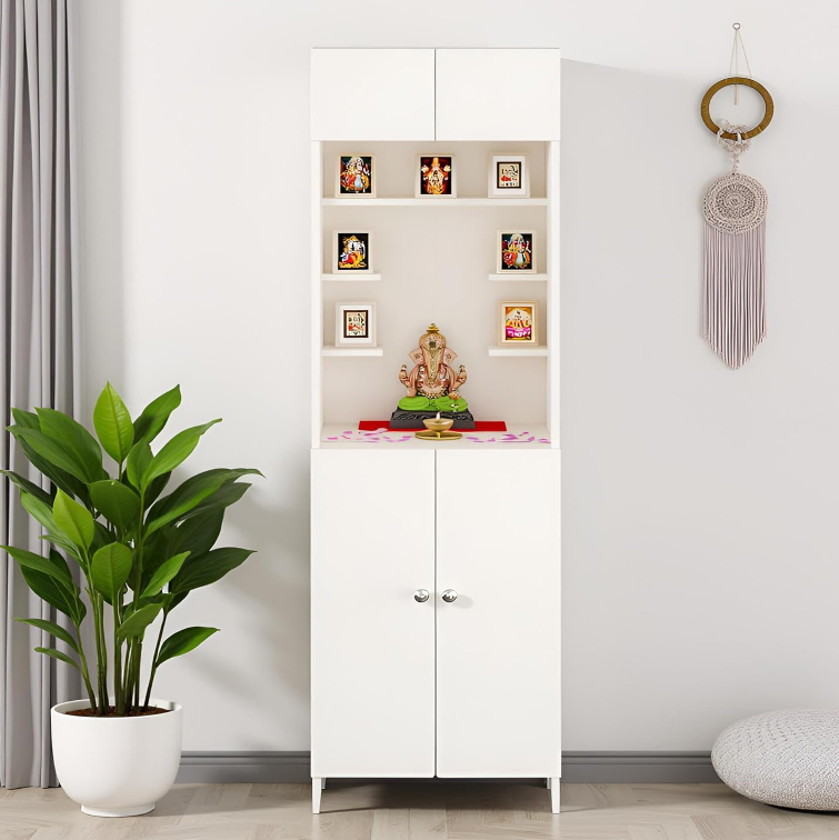 Customized white wooden wall mounted Pooja Mandir Family Worship Temple