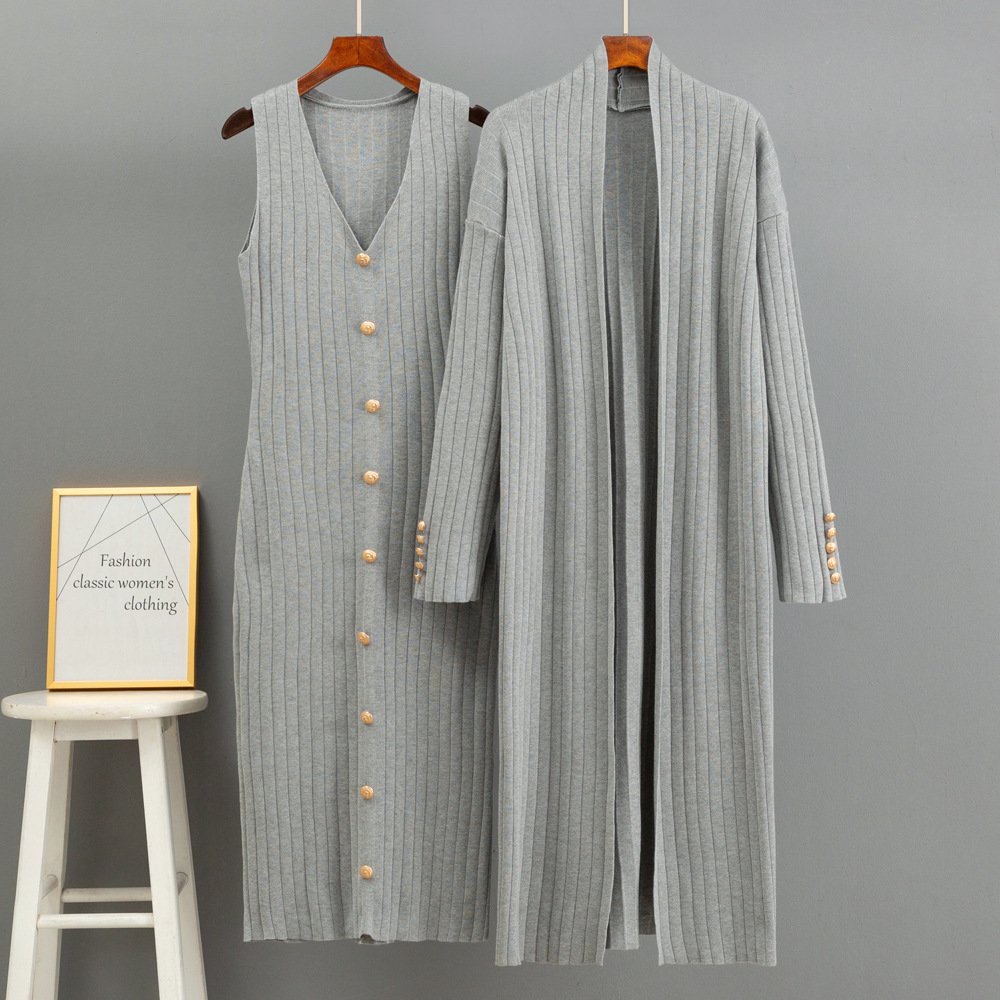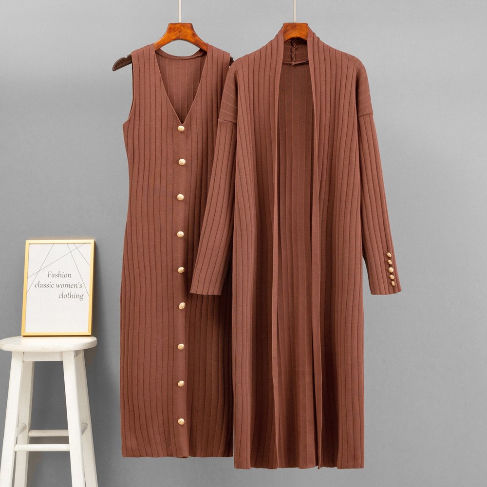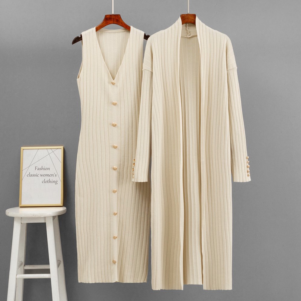 Ladies Suit Knitted Twinset V Neck Sleeveless Midi Dress Long Sleeve Cardigan Women's Clothing