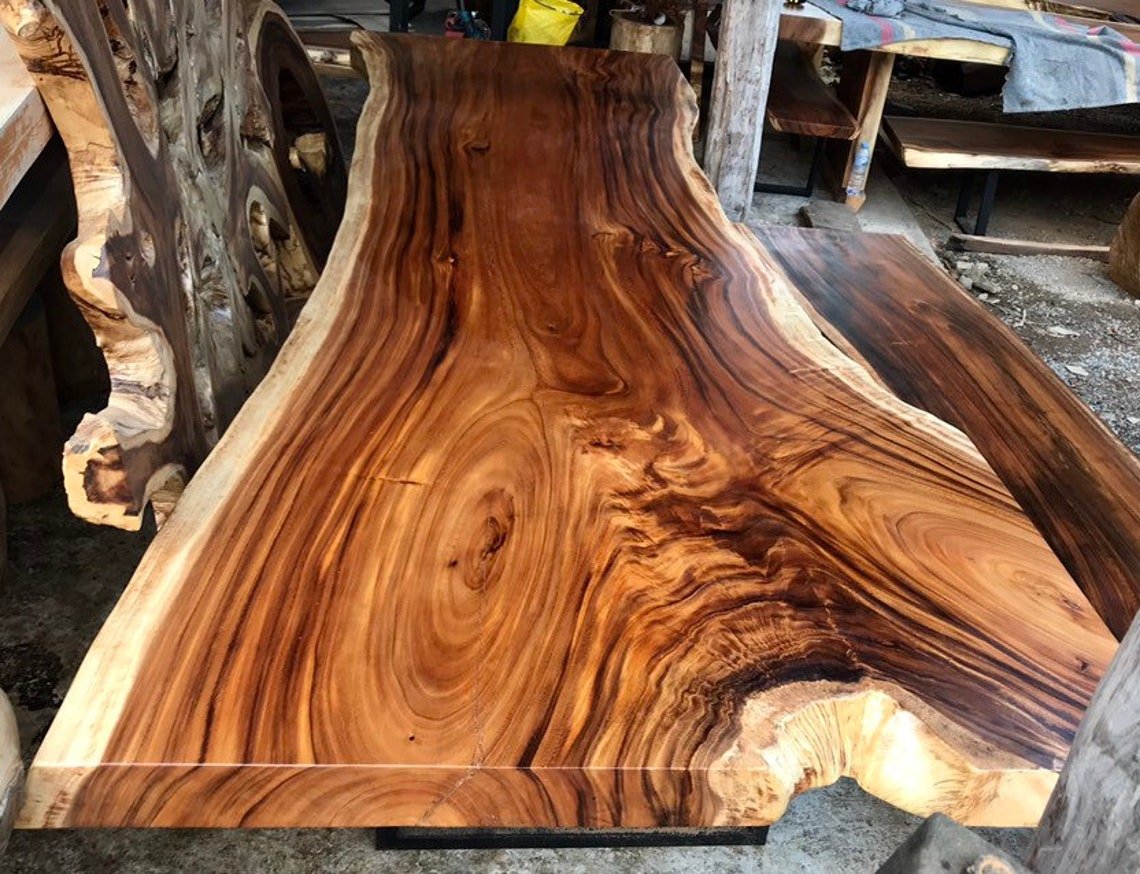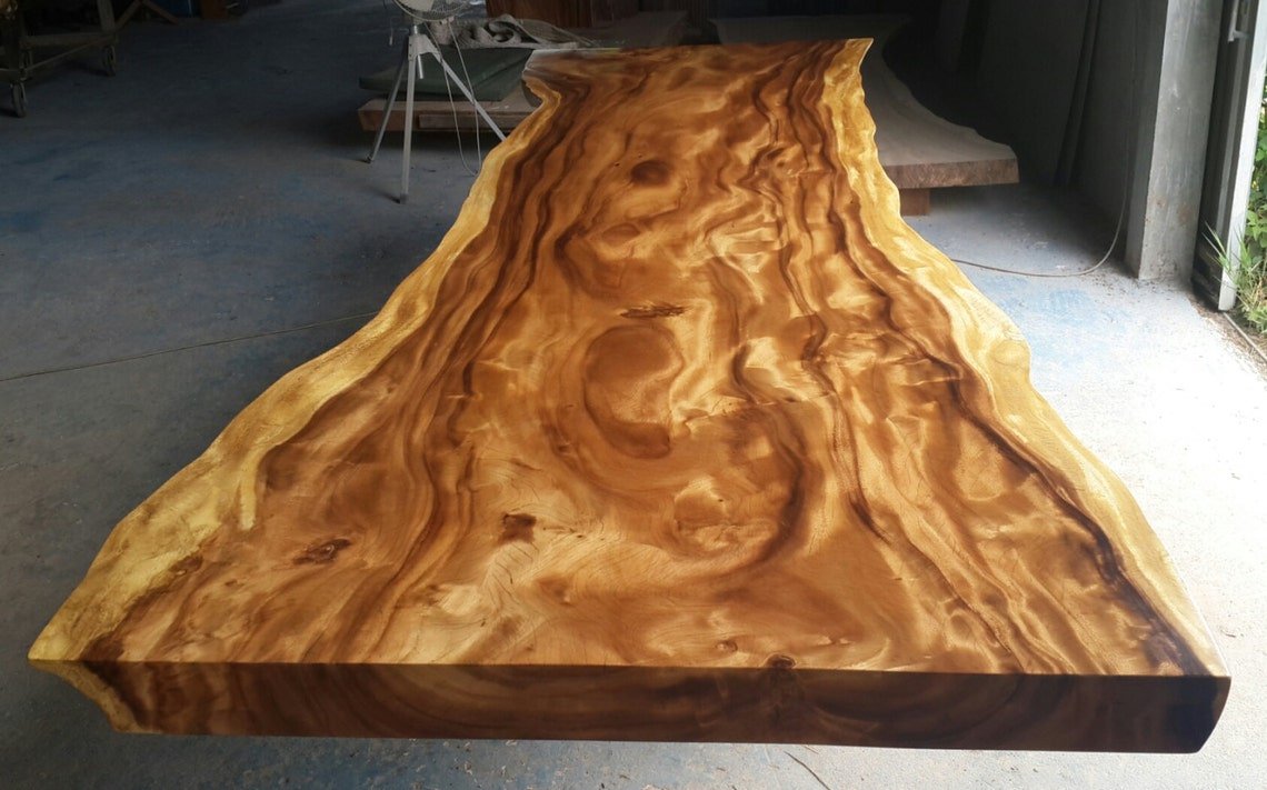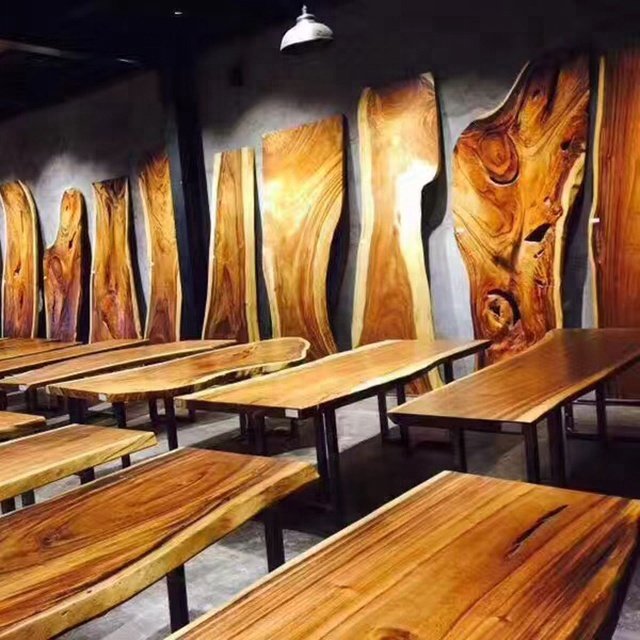 Solid walnut flat wooden tabletop with natural grain and meat chunks with active edges, stock, used for restaurant and kitchen labels